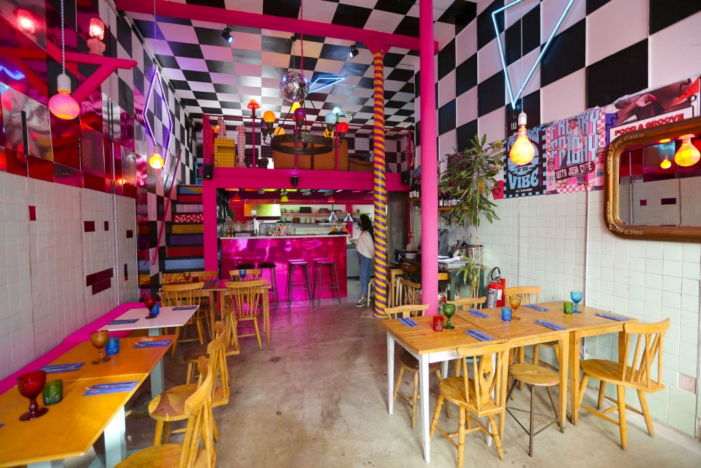 Cartazes colados à mão, néons coloridos, paredes em xadrez, espelhos e candeeiros antigos e um cor-de-rosa forte. Quem sair dos restaurantes Dr. Bernard e Palms, ambos no paredão da Costa da Caparica, e entrar neste Dr. Bernard Boa Vida, em São Bento, encontra o mesmo tipo de linguagem e oferta gastronómica criados por Gregory Bernard – um ex-realizador de cinema na Califórnia que encontrou, na Costa, uma vida assente na restauração, surf, ioga e bem-estar. Com uma diferença: em Lisboa, é a chef Leonor Godinho (ex-Musa e Feitoria) que lidera a cozinha.