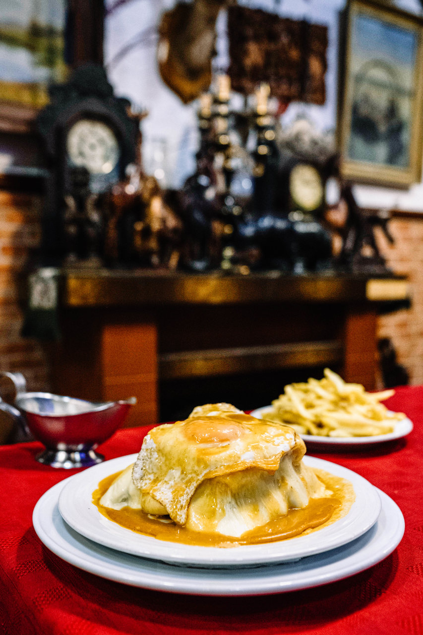 Na sala mais ampla do Café S. João, os olhos comem primeiro: há 700 garrafas de vinho junto ao teto, louças, relógios, quadros e outros objetos que refletem a paixão do dono por antiguidades. José António Santos e mais dois filhos conduzem os destinos da casa, que soma 18 anos, cinco deles nas suas mãos. O fundador trabalhou no A. Cunha, que era conhecido pelas francesinhas, também em Canelas (um espaço que, entretanto, se mudou para Ramalde, no Porto); até que criou o próprio negócio, explica José. Como o Café S. João “já tinha a fama da francesinha”, manteve-lhe o nome e o conceito; só fez algumas alterações ao molho, diversificou a oferta e aumentou o espaço.