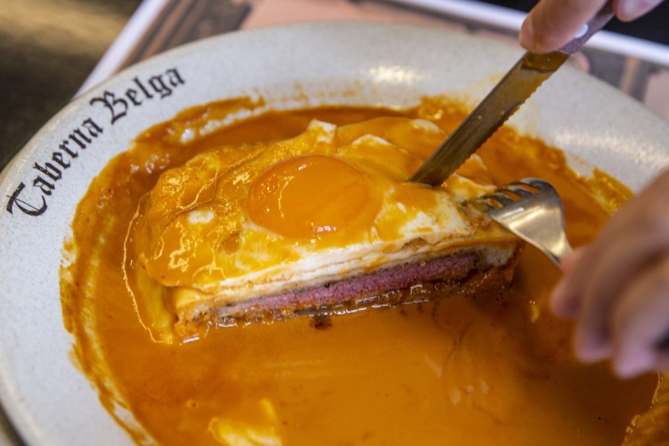 A francesinha é o prato mais pedido na Taberna Belga, como se comprova olhando para as mesas num simples dia de semana, ao almoço. Pão de forma, fiambre, bacon, linguiça de porco preto de Barrancos, bife de entrecôte do Uruguai, queijo e ovo compõem a sanduíche normal, que custa 9,25 euros e difere das do Porto sobretudo pelo molho, mais adocicado e não muito picante – até porque a casa é bastante frequentada por crianças.