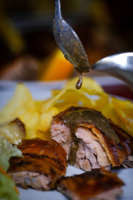 No forno aquecido a lenha só entram, assim, animais com menos de cinco quilos que, após uma “assadura que demora entre duas e duas horas e meia, ficam com o tamanho ideal para que, à mesa, cheguem pequenos peças de pele crocante e carne suculenta. Quase todas são costelas, acompanhadas por batatas fritas que o azeite deixa estaladiças e uma salada confecionada com tomate, alface e cebola colhidos dos campos das redondezas. O molho para barrar a carne é feito com banha de porco, pimenta, alho, sal e vinho. “E um ingrediente secreto à base de fumeiro”, que também é usado para untar o interior do leitão antes da assadura.