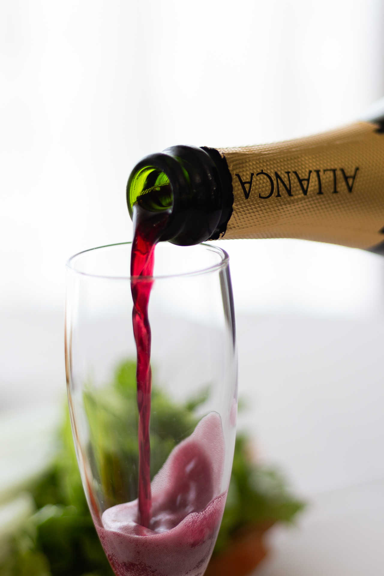 O leitão é servido com um frisante engarrafado propositadamente para a casa.
