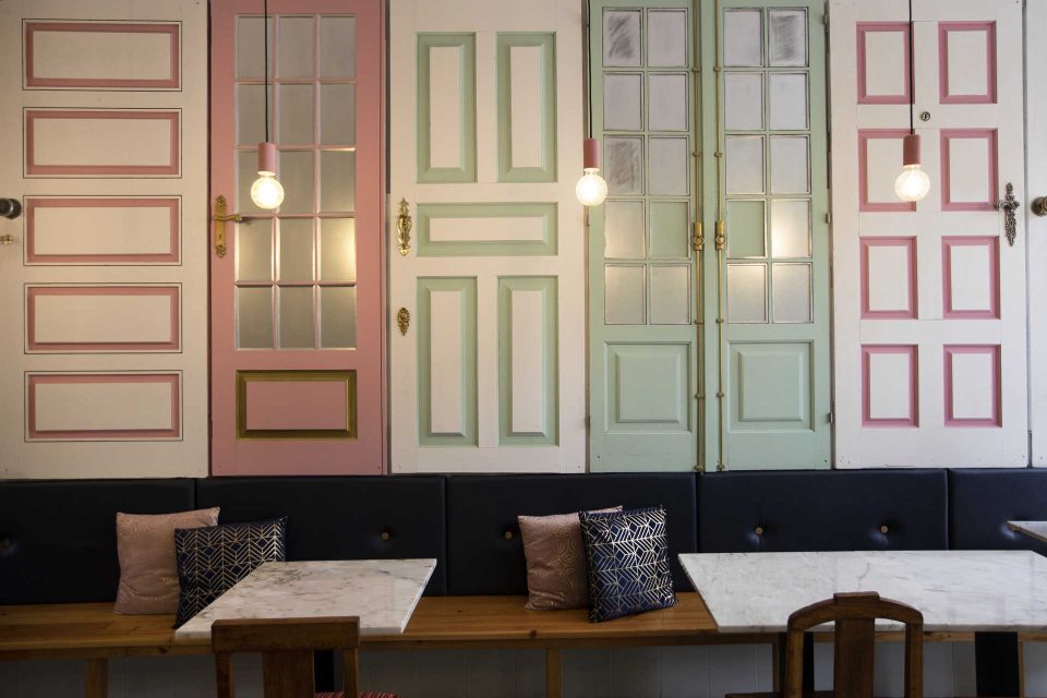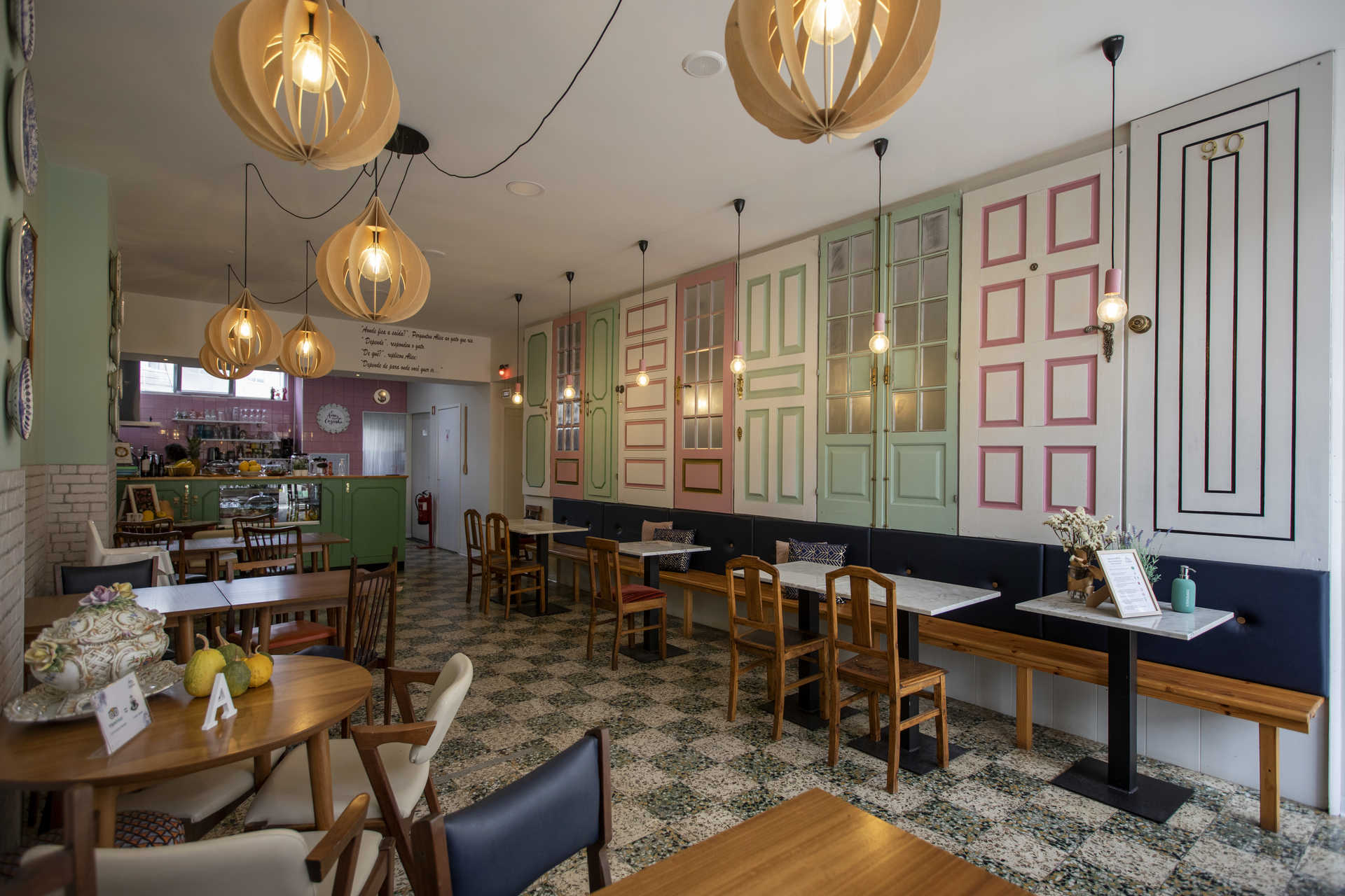 Uma parede forrada com portas de diferentes cores e feitios. Tijoleira de padrão axadrezado, em preto e branco. Pratos decorativos e quadros trazidos de casa dos avós. Estes são alguns pormenores do interior da cafetaria O Amor vive na Cozinha, que se instalou numa antiga loja de ferragens na Praça do Comércio, agora a parecer uma cena da história Alice no País das Maravilhas (e há até um excerto do conto numa parede).