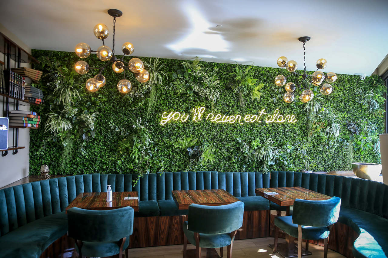 Sofás de veludo, jardins verticais e luzes néon compõem o ambiente elegante e jovial do Perth. A ideia foi criar um lugar acolhedor, com elementos naturais e “onde as pessoas se sentissem confortáveis”, realçam as sócias Joana Bradley e Fátima Lessa. Ao espaço amplo e luminoso juntaram recantos “instagramáveis”, que fazem de cenário para os pratos coloridos e fotogénicos do menu.