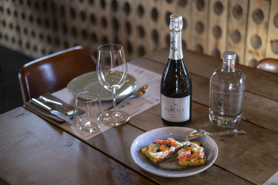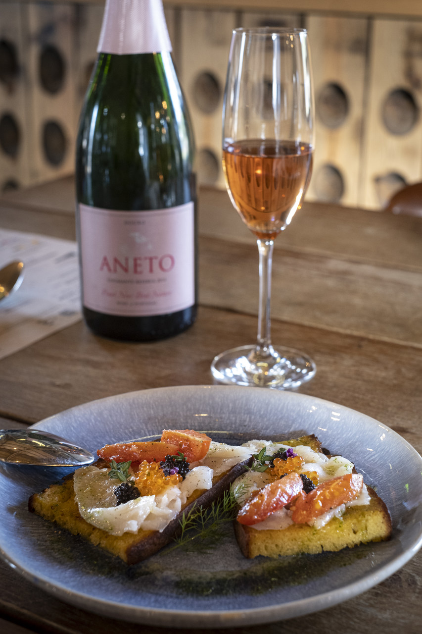 Ali, cada prato é pensado para harmonizar com um dos rótulos da marca, utilizando produtos regionais na sua confeção, como o fumeiro e os queijos, mas em sugestões leves e frescas, que fazem sobressair o vinho. É o caso da tosta de bacalhau fumado com tomate cherry, regada com azeite produzido na quinta e ervas para dar frescura.