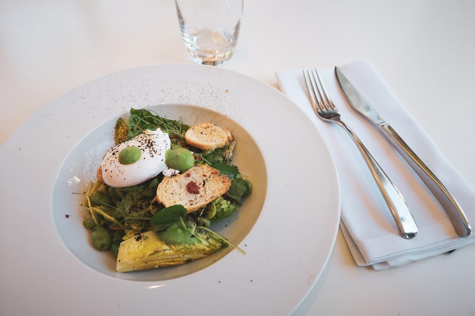 Pedro Rebelo dos Santos, 43 anos, inspirou-se nas memórias de estar com as avós a descascar favas para criar esta salada que surge nas entradas frias da carta do Glass Terrace, no Sheraton Cascais Resort. “Era um momento de reunião familiar, íamos conversando enquanto abríamos as favas”, recorda, explicando que no hotel as recebe de um produtor local. A salada fria de favas vem com ovo confecionado a baixa a temperatura, crostini, coentros e telha de pão do dia e lembra as ervilhas com ovos escalfados, mas a associação fica-se por aí.
