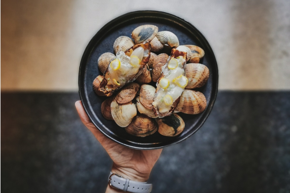 Depois do couvert – onde cabem pão de massa-mãe e fermentação lenta, foccacia caseira, brioche que leva puré de batata na sua massa, pasta de algas e azeitonas e manteiga envelhecida – vão chegando as novidades. Nomeadamente, o tupinambo assado, que nos leva à horta e ao mar, com bivalves e lâminas de mão de buda, uma variedade de limão asiático. A maresia mantém-se no segundo snack, com a gamba da costa algarvia, curada em açúcar e sal “só para lhe aumentar a firmeza”, conta o chef, que acompanha com crouton caseiro e molho de cabeças de carabineiro.