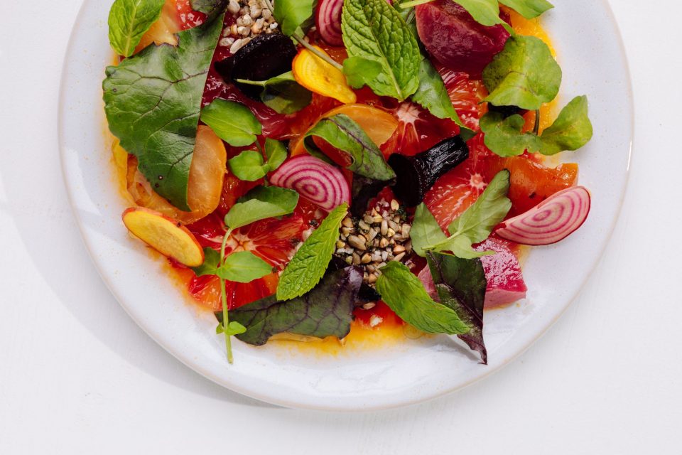 Cortar as beterrabas fumadas e dispor aleatoriamente por cima das rodelas de citrinos Picar grosseiramente 30g de sementes de girassol e polvilhar por cima