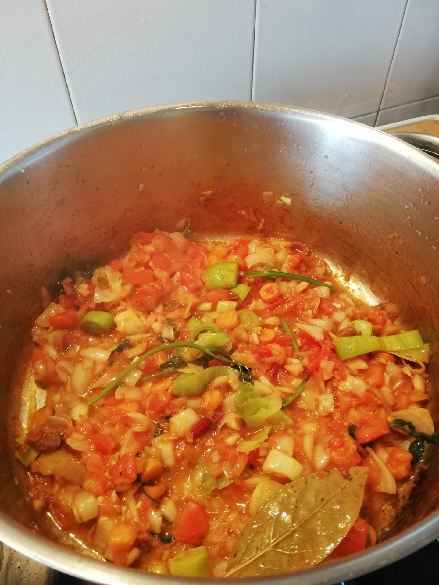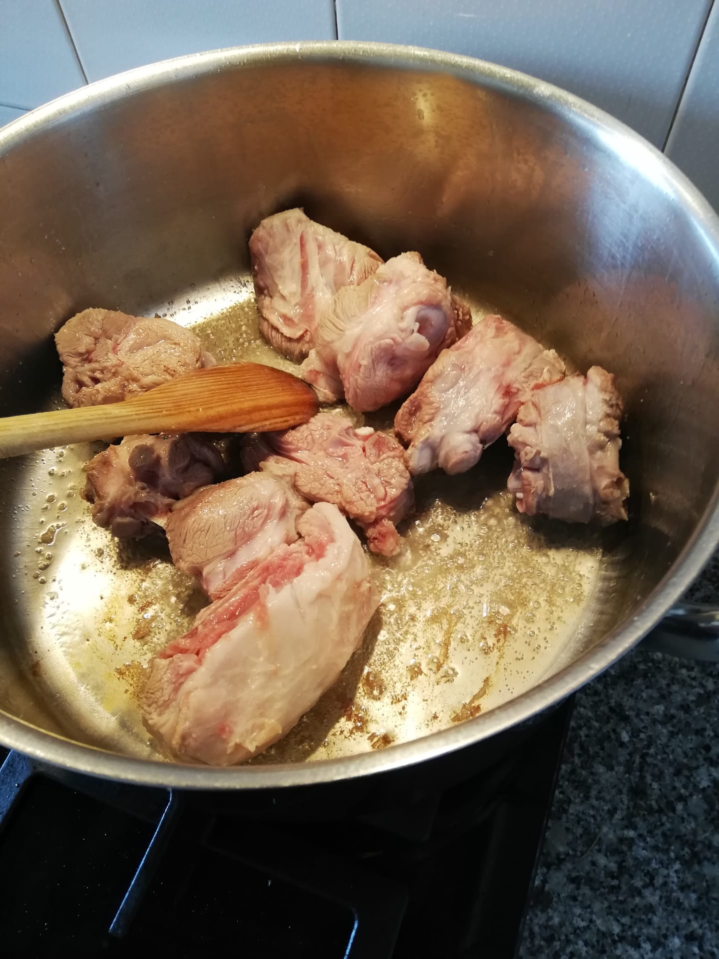 Partir o borrego em bocados e corar em banha. À parte, fazer um refogado com azeite, presunto, cebola e alho picado, cenoura às rodelas, alho francês laminado e tomate aos bocados. Deixar corar e refrescar com vinho branco. Adicionar à carne o sal, a salsa, o louro, o alecrim, a malagueta, a pimenta e o tomilho. Tapar. Acrescentar água aos poucos, até cozer. Retificar temperos.