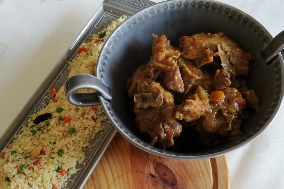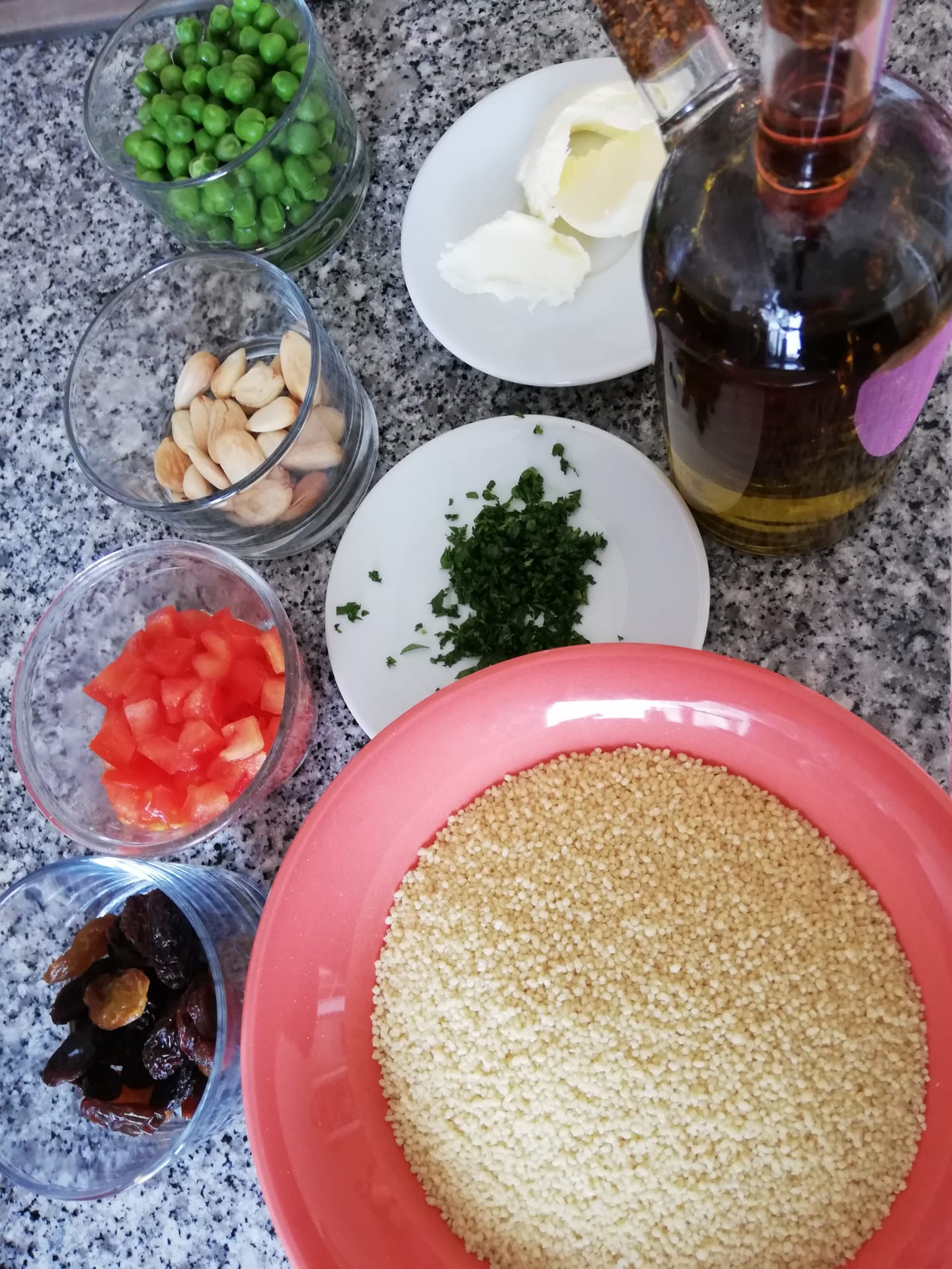 Colocar a água ao lume com o azeite e sal. Quando ferver, retirar do lume e juntar o couscous. Mexer. Deixar repousar três minutos, até a água ser totalmente absorvida. Levar de novo ao lume brando ou banho-maria. Juntar duas colheres de sopa de manteiga e mexer. Adicionar tomate cortado em pequenos cubos, ervilhas previamente cozidas, corintos, amêndoas tostadas, sultanas e alperces laminados. Salpicar com salsa picada. Para dar um toque diferente ao couscous, juntar uma pitada de canela em pó ou açafrão.