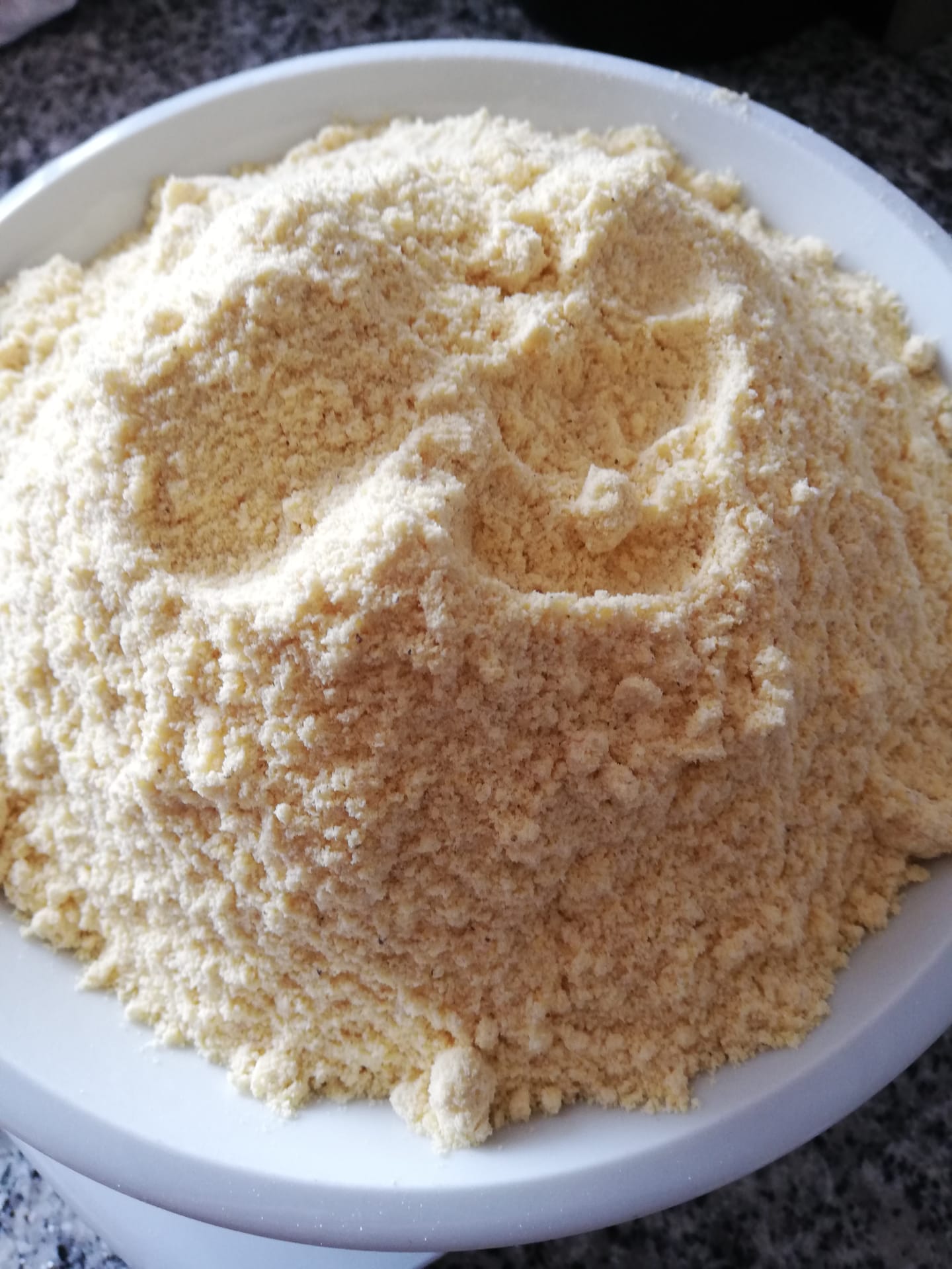 Numa tigela, juntar a farinha de milho com o sal e escaldar com a água a ferver, mexendo com a colher.