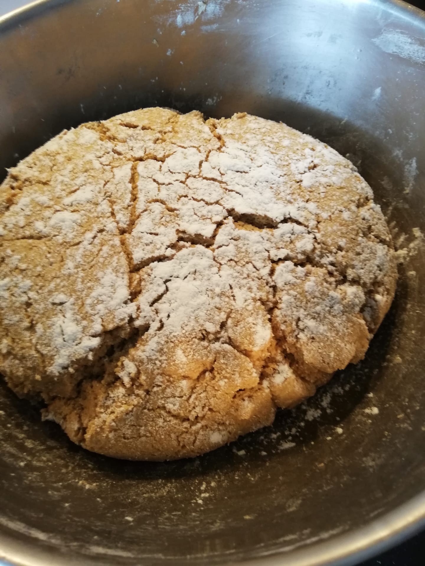Polvilhar a massa com farinha, cobrir com um pano e deixar repousar/fermentar durante uma hora, aproximadamente.