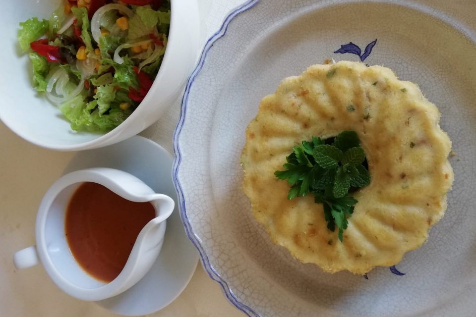 Pudim de bacalhau com ervas aromáticas e molho de tomate