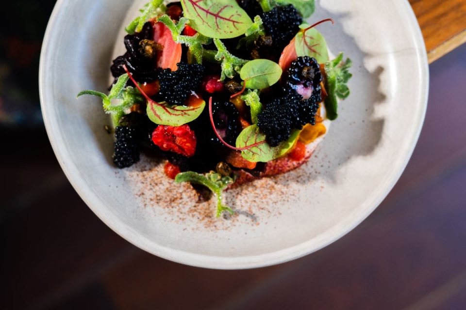 A lista continua com uma criação à base de beterraba fumada, óleo de pimenta rosa, creme de caju, alcaparras, sriracha, framboesas, amoras e ice plant; e outra com ajo blanco, melão, pepino, óleo de poejo, amêndoas e flores do Jardim; e ainda salmorejo de tomates do Oeste com sorbet de pepino, pão de fermentação de massa mãe, gambas, óleo de salsa e lemon balm. Em casa, também é possível desfrutar do menu do restaurante, através da aplicação de entregas Volup.