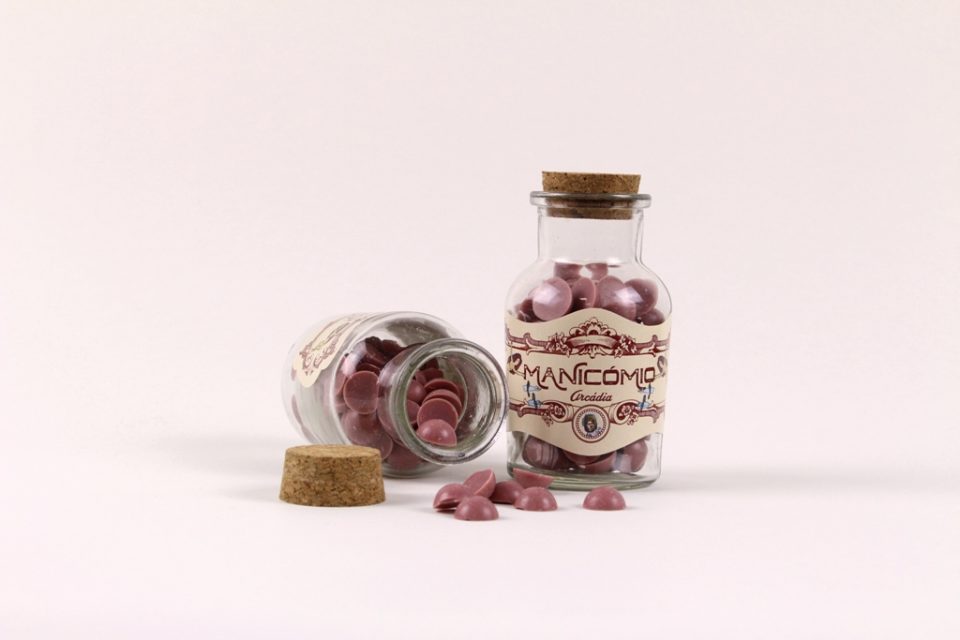São chocolates em formato de comprimidos e vêm dentro de um frasco de vidro com tampa de cortiça, a lembrar as antigas embalagens de medicamentos. O packaging foi desenvolvido com ilustrações dos artistas do projeto Manicómio.