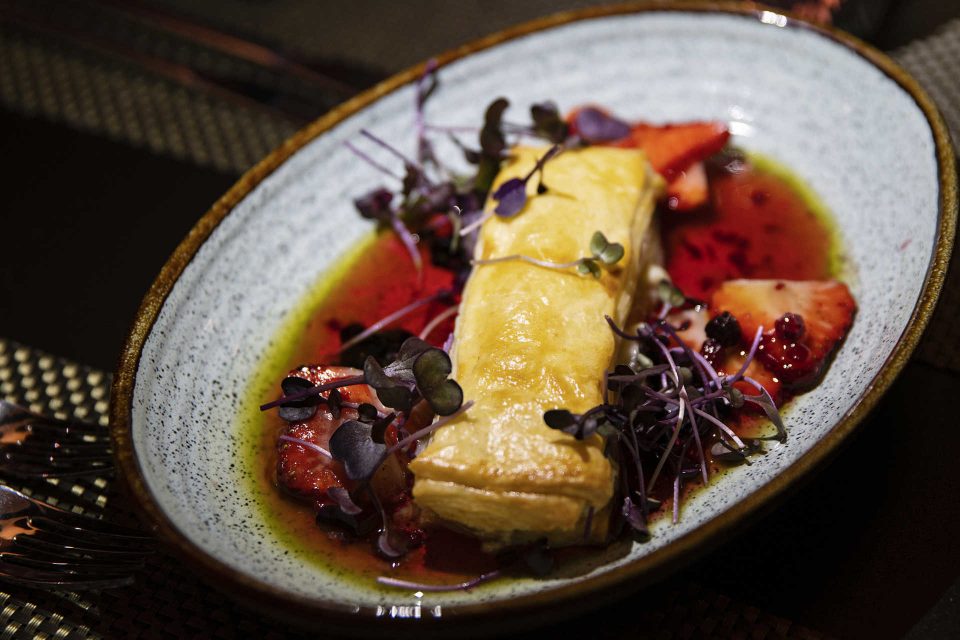 Também a ementa surge renovada. Da anterior transitam só alguns pratos que tiveram especial saída, como o folhado de chèvre (queijo de cabra), morangos, redução de vinagre balsâmico e emulsão de manjericão; e o salmão micuit (meio cozido), pérolas negras de sagu (tapioca com tinta de choco), creme de funcho, pickle do mesmo e pó de alho francês.