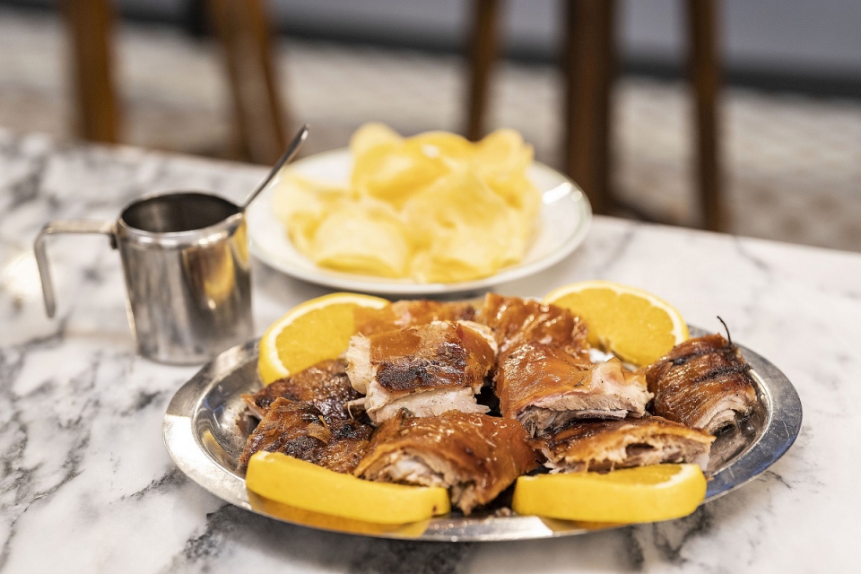 Manuel Silva e João Monteiro maturaram a ideia do espaço que abriu em março deste ano com vista para a principal avenida de Aveiro. Trouxeram a experiência de assar porco no espeto em festas espalhadas por este país fora. “É a primeira casa a ter porco no espeto entre paredes, indoor, a ter esse conceito, como se fosse uma festa tradicional”, revela Manuel Silva. As fatias de pernil vão para dentro do pão e chegam à mesa com ou sem queijo da serra, à vontade do cliente. O leitão é servido em travessa, no pão ou ao quilo, batata frita a acompanhar, e chega à tasca em dois momentos do dia, diretamente de uma casa especializada, por volta das 12h15 e pelas 19h15. “Está sempre fresquinho”, garante Manuel Silva.