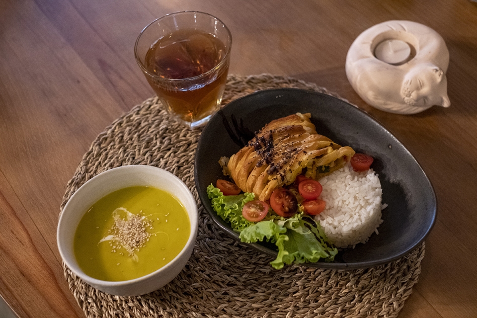 A casa também é forte nos doces, que têm especial saída durante a tarde, e disponibiliza uma variedade de bebidas, inclusive orgânicas. Seja qual for a opção, é para apreciar num ambiente acolhedor, com madeiras, plantas, livros e figuras de gatos um pouco por todo o lado – do puxador da porta às cadeiras, passando pelos suportes das velas.