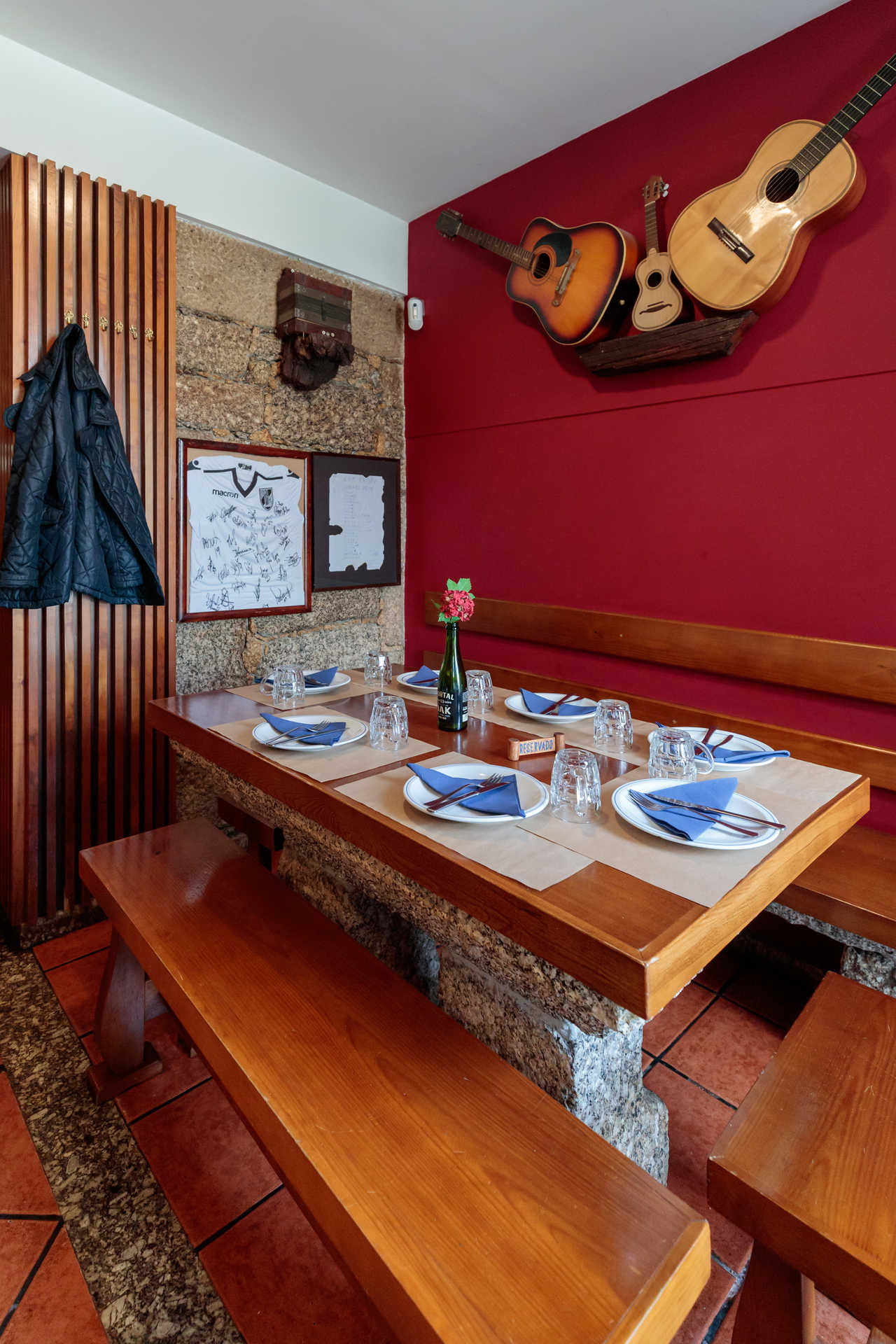 Essa cozinha de conforto faz encher de comensais e visitantes de longe o pequeno restaurante, de paredes em pedra descoberta, mesas e bancos em madeira e tijoleira alaranjada. A mesma atmosfera rústica desde há quase 20 anos. “O meu pai foi o autor disto tudo, ele estava ligado à construção na altura e aquelas mesas em pedra foi ele próprio que fez. Depois começou o gosto pela cozinha…”, conta Daniel.