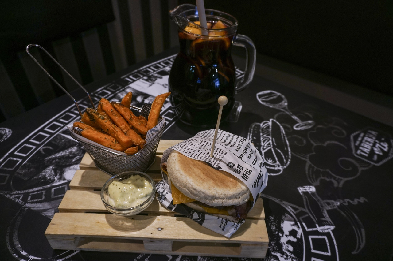 O hambúrguer à taberna leva fatia de presunto. Há hambúrguer vegetariano e outro em bolo de caco com maionese de queijo azul. O prato do dia varia e é apenas um, carne ou peixe. Tanto podem ser filetes de pescada com salada russa, ou carne de porco à alentejana, alheira no forno, costeletas à salsicheiro, bifanas no prato, panados com arroz de feijão, lombo do cachaço assado.