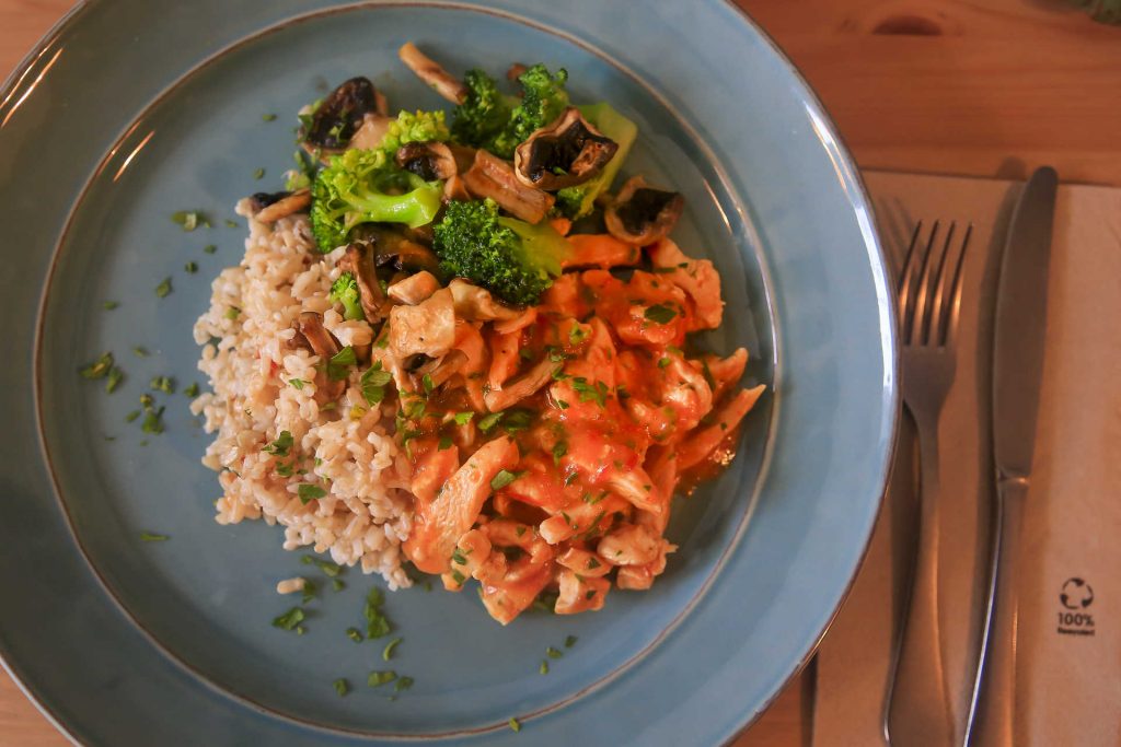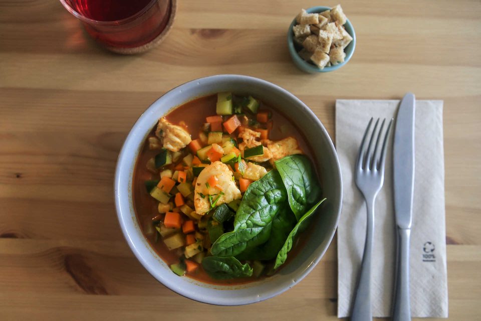 No restaurante de tons claros e decoração frugal há diariamente um prato de peixe, outro de carne e outro vegetariano, confecionados com pouca gordura e pouco sal – e um deles baixo em hidratos de carbono. Com esta carta, Tânia quer demonstrar que “a comida saudável não tem de ser insípida”, apresentando a prová-lo o reconfortante ensopado de peixe com legumes e croutons, o hambúrguer de feijão ou o strogonoff de peru com arroz integral.