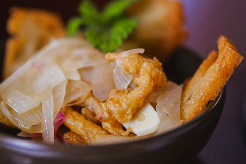 Replicando o leque de pequenos pratos do Híbrido com “receitas tradicionais recriadas”, o chef propõe uma coleção de petiscos, dois por pessoa, para que a mesa seja farta. O primeiro não podia ser mais simples: fatias de pão alentejano dentro de um talego com conduto, isto é, manteiga corada e azeite. A partir daí o chef leva os comensais numa viagem pelos costumes do Alentejo, que se refletem em vários pratos. Um deles dá pelo nome de coelho à São Cristóvão, desfiado e temperado em alho e coentros, azeite e vinagre.