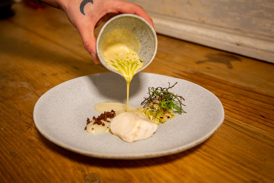 Trabalhando com produtos regionais colhidos num raio de até 40 quilómetros, o chef garante estar atento à “microsazonalidade” de alguns deles, mas também os sabe trabalhar e aplicar em receitas com base em técnicas de fermentação e cura. O menu atualmente disponível começa com uma tartelete com mousse de fígado, pele crocante de frango e gel e pó de hibiscos, que antecede o momento do pão de trigo barbela, com fermentação de 24h, acompanhado de duas manteigas e azeite.