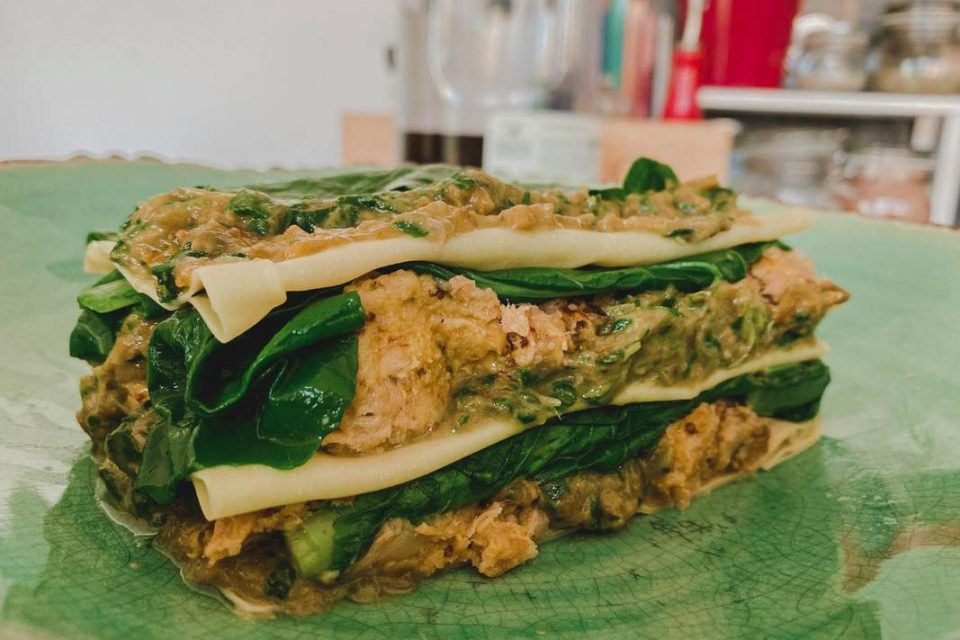 Ingredientes: nabiça (8 folhas grandes); massa fresca (preferencial, 3 placas); alheira de caça (preferencial, 1 unidade); limão (1 unidade pequena); gengibre (1 bocado); pickles de cebolinha (6 unidades); líquido dos pickles (1 colher de sopa); mostarda de grão (preferencial, a gosto); pimento verde (1 unidade); cebola (1 unidade); alho (1 dente); azeite (1 golpe).