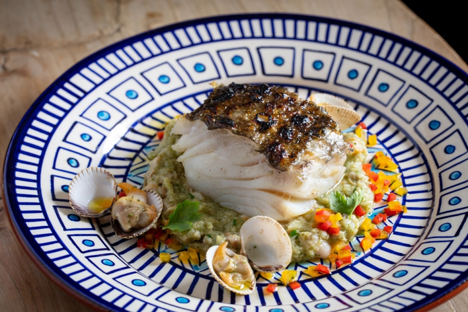 Bacalhau assado com migas de piso de coentros e berbigão (24 euros)