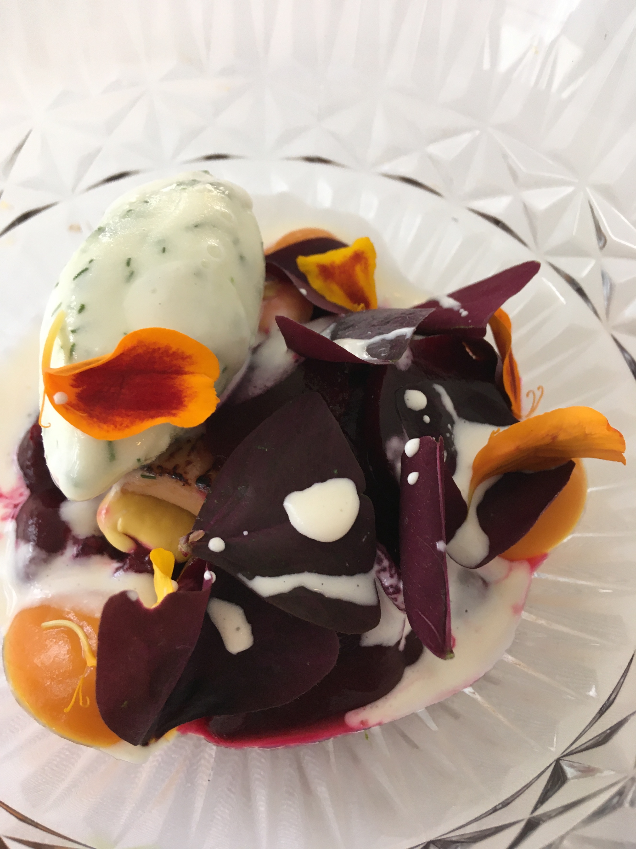 O terceiro momento é Beterraba, mostarda, tremoço e cebolinho e confesso que tremo com receio, são vezeiros os cozinheiros que propõem o tubérculo com total descuido com os amargos e outras agruras, mas aqui há um trabalho de ourives feito pelo grande Hugo, e percebo que cozinha como respira.