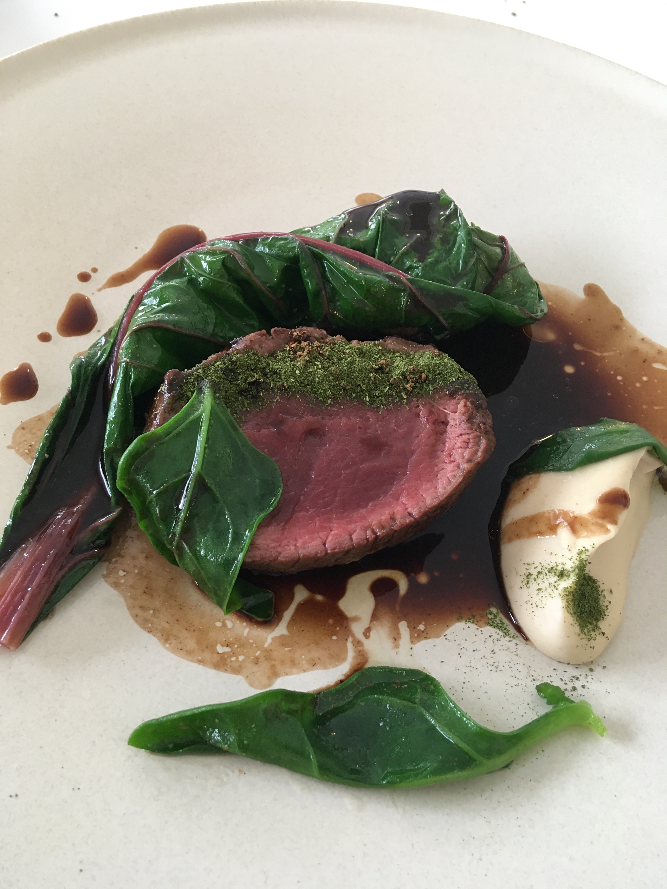 Surge o segundo momento, Truta, cherovia, endro e ervas do campo, que me colocam em estado de grande felicidade. Impressionante fusão de sabores, ligação microscópica dos produtos entre si e a proteína principal – truta salmonada – a vencer com extrema naturalidade.