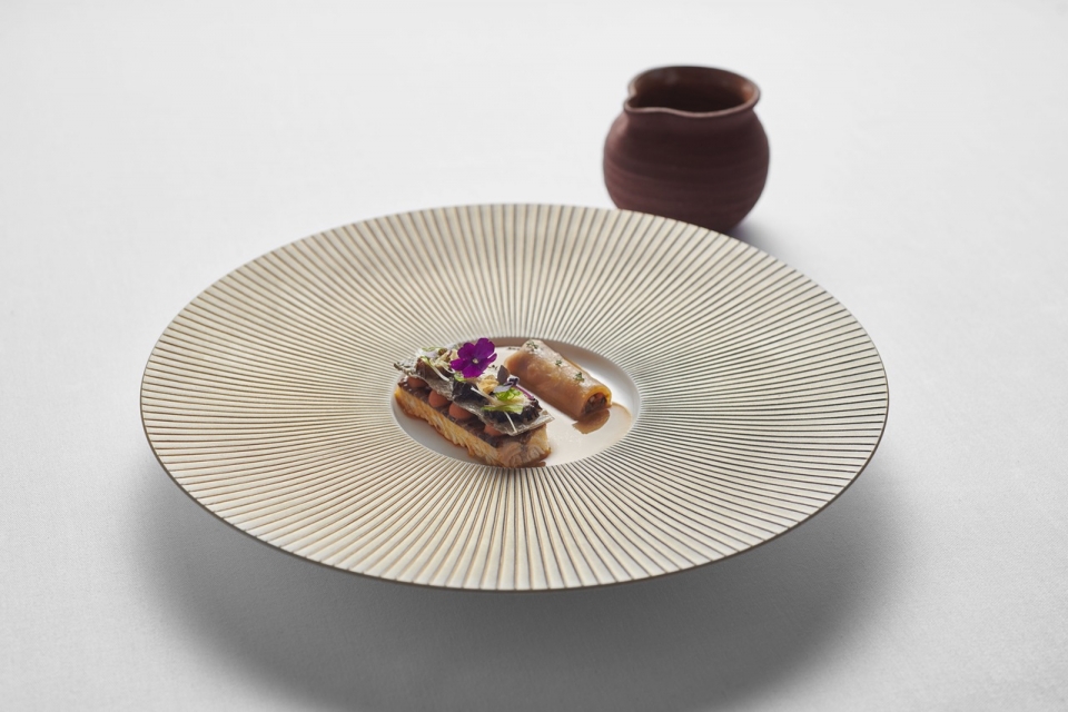 O menu adotado é o vasto e exaustivo Evolução de Aromas (250 euros), a que junto a opção Prime (250 euros) para o acompanhamento vínico. Genial a minitransumância inicial dos petiscos servidos no bar. Suspiro liofilizado, cozido português – texturas de couve e terrina, terminando com caldo -, seguido de atum fresco com alga nori e gengibre. Vem a pinça de lagostim – duas peças que se desfazem na boca – de sabor intenso e a encher o palato à laia de empreitada marisqueira e ainda é colocada a fabulosa entrada de santola, caviar e waffle. Esta pequena aventura no bar foi hidratada pelo espumante bairradino Colinas blanc de blancs 2016, agora propriedade do Yeatman. Excelente desempenho.