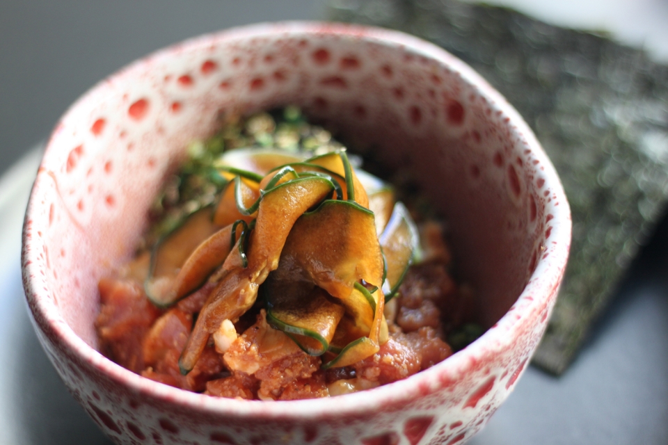 Acompanhar com folhas de alga nori com as quais se fazem pequenos “tacos” recheados do atum.