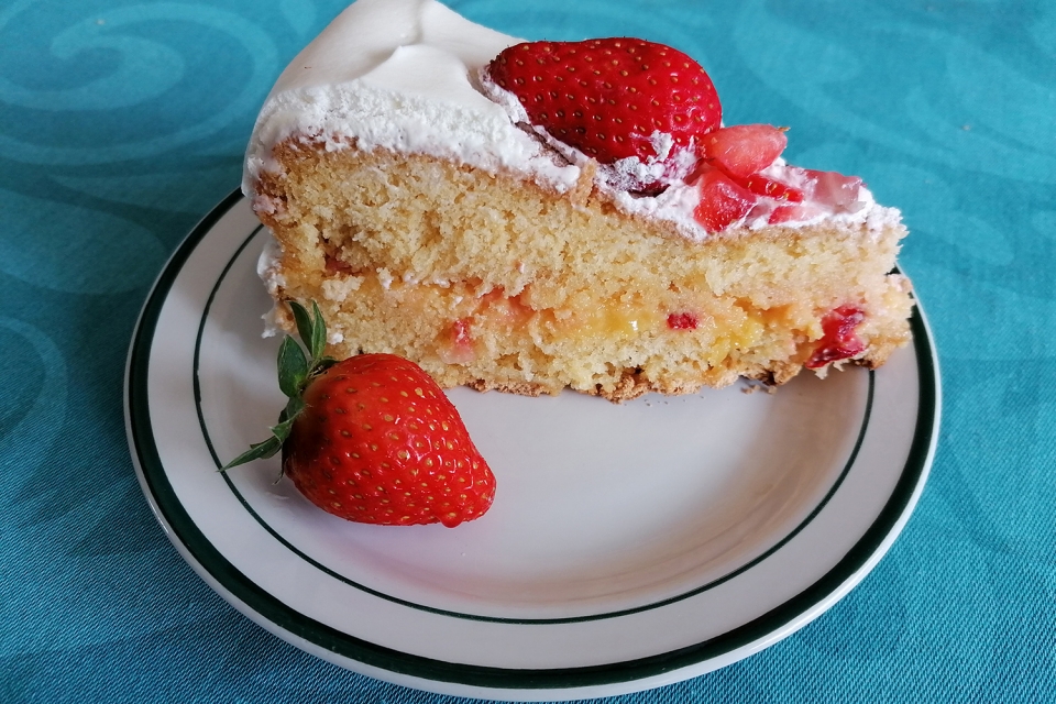 Separar as gemas das claras. Bater as gemas e o açúcar até obter uma mistura fofa. Bater as claras em castelo e juntá-las, envolvendo devagar. Adicionar a farinha e o fermento. Pôr numa forma untada e enfarinhada e levar ao forno, cerca de 40 minutos, a 180º. Depois de frio, cortar o bolo ao meio e rechear com curd de limão ou chantili (basta bater as natas e juntar duas ou três colheres de açúcar). Acrescentar a esse recheio morangos cortados aos bocadinhos, para humedecer o bolo. Cobrir tudo com chantili e enfeitar com morangos (ou frutos vermelhos).