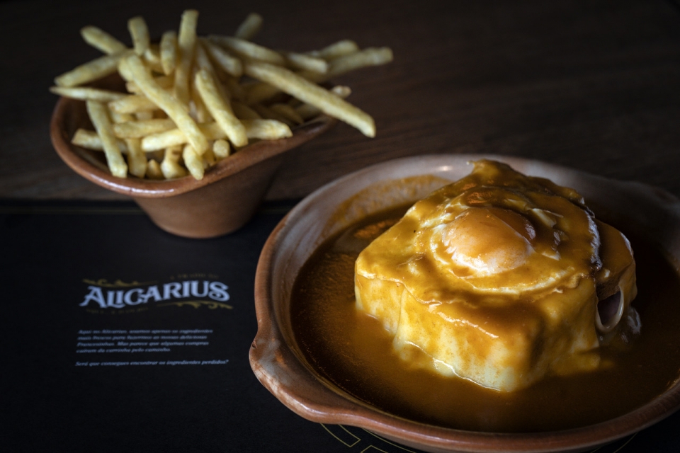 Há mais de dez francesinhas na Alicarius, da francesinha de atum à vegetariana. Mas a que sai mais é a original, conta Filipe Santos, acrescentando que o molho é menos picante do que os do Porto. A casa está a funcionar em modo takeaway e com entregas, através das plataformas habituais ou do seu serviço próprio, que é gratuito, dentro de Aveiro, caso se encomende pelo menos três francesinhas.