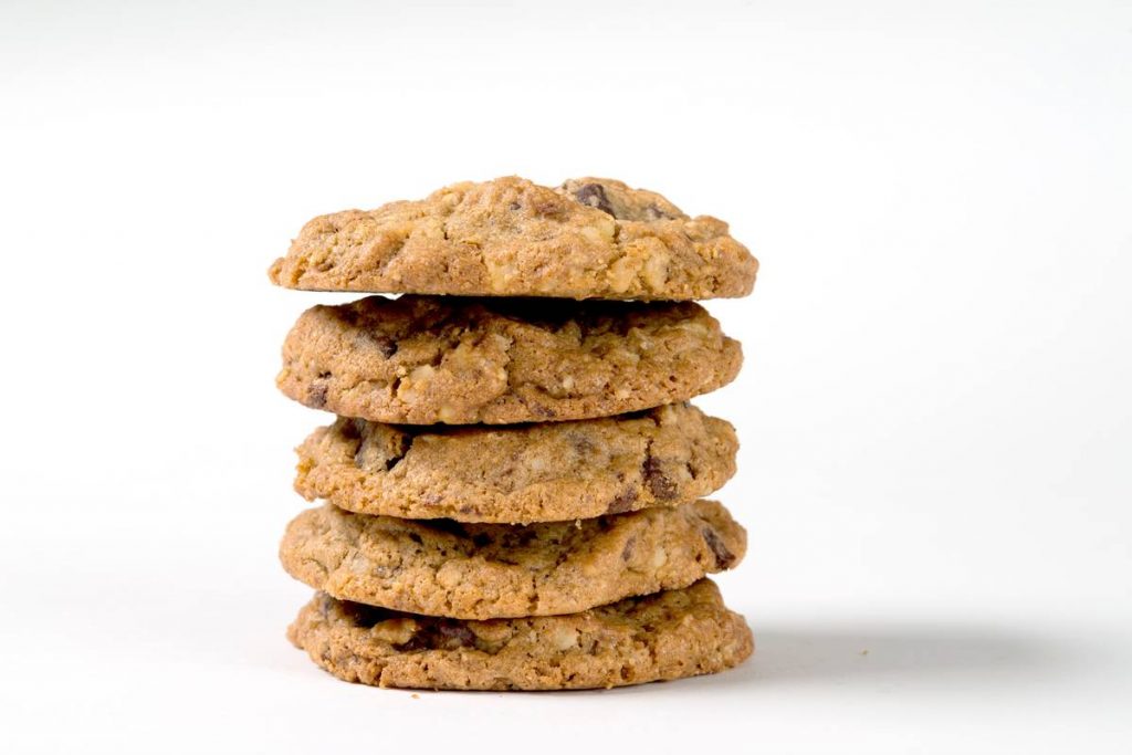 INGREDIENTES: (manteiga à temperatura ambiente – 226gr); açúcar granulado (16gr); 2 ovos (L); extrato de baunilha (6.25ml); sumo de limão (1.25ml); farinha (280gr); aveia em flocos (45g); fermento em pó (6gr); sal (6gr); 1 pitada de canela; pepitas de chocolate semi-doces (465gr); nozes picadas (220gr).