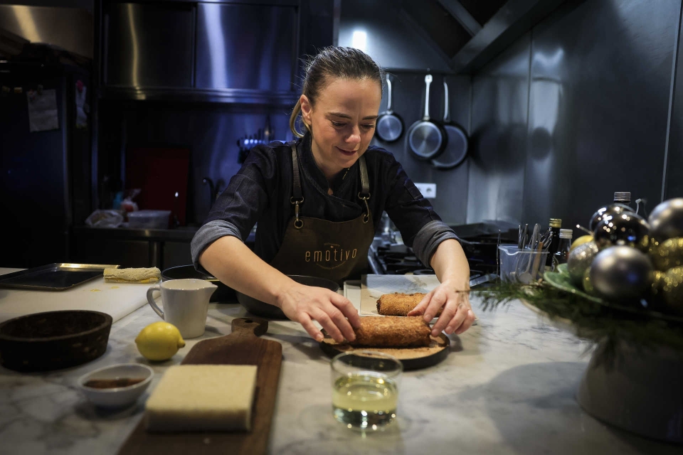 Sara Verde sugere “algo tradicional, de raiz, para seguir a linha do restaurante”. A chef abriu o Emotivo, no Porto, em 2020, ainda nos tempos muito incertos do primeiro desconfinamento da covid 19. Nem foi preciso coragem: “Já tinha tudo montado, o que é que ia fazer?”, lembra.