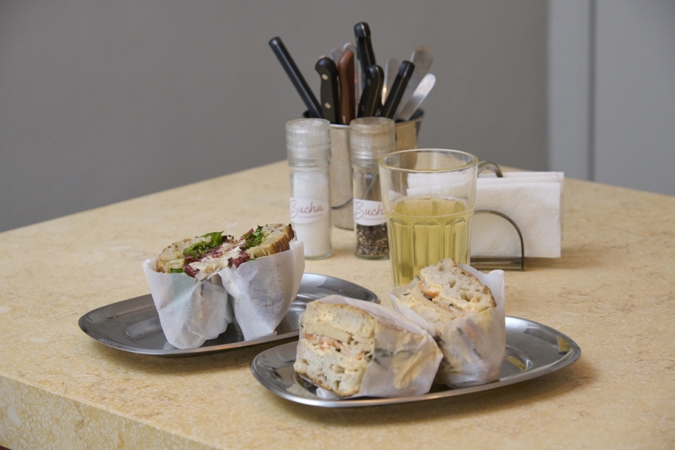 Há ainda a sandes de rosbife marinado em azeite, limão e tomilho, com molho cremoso de rábano, couve roxa, rúcula e alface; a de filetes de cavala enlatadas com limão, combinadas com molho de caril, sriracha, couve roxa, agrião e rúcula; e ainda a opção vegana, a sandes de filetes de tofu marinados num molho asiático, sriracha, cenoura e pepino. Comum a todas as sandes são as focaccias artesanais de fermentação lenta, feitas pela Do Beco, padaria de Arroios eleita pelos donos d’A Bucha depois de testarem vários pães diferentes.