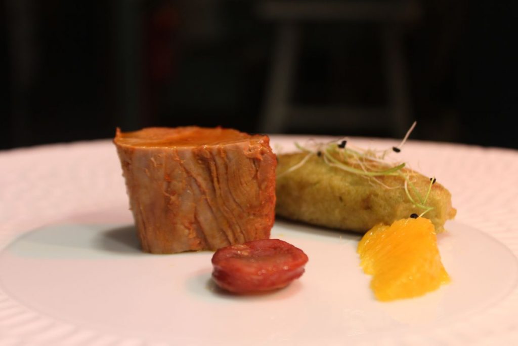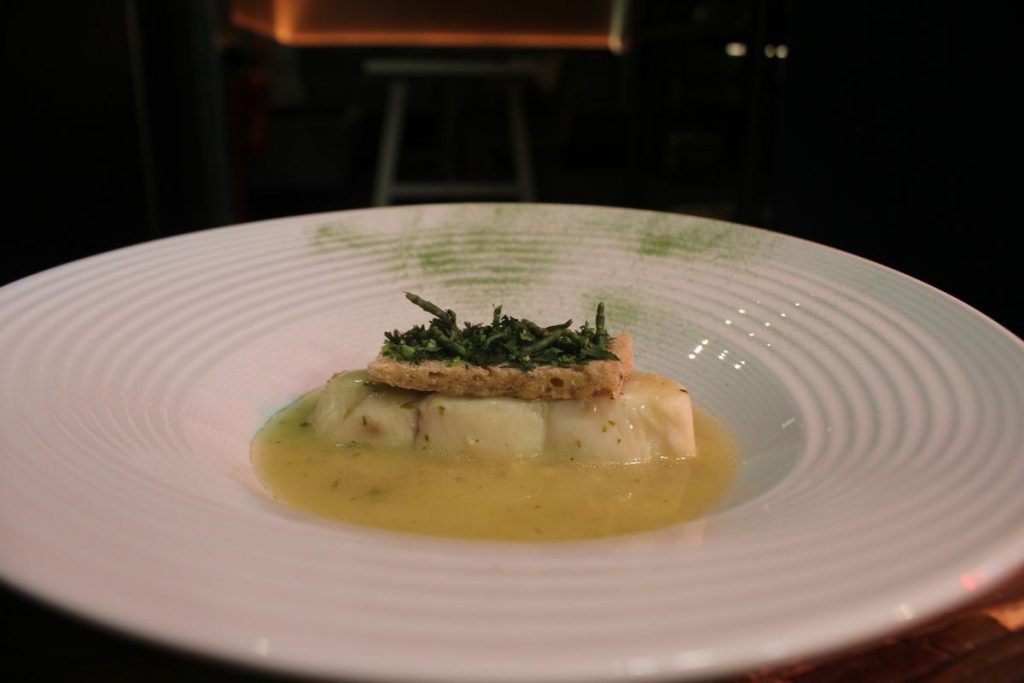 O segundo momento é um gaspacho alentejano – no fundo uma sopa fria de tomate, pepino, aipo e orégãos – e abre caminho à sopa de cação com tosta de salicornia e pó de coentros, aqui numa versão mais reduzida e de estética apurada face ao prato regular disponível na carta, mas cheia de sabor. As lascas de peixe desfazem-se no prato.
