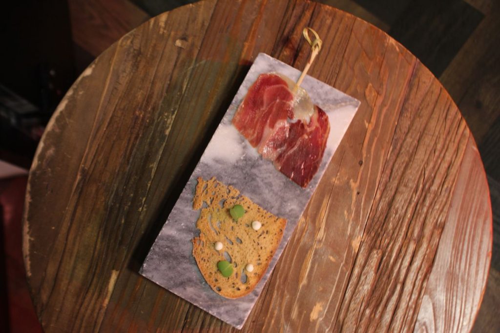“É um menu de degustação muito baseado no pão, nos coentros e nas ervas aromáticas”, explica o chef momentos antes de o couvert chegar à mesa com um cesto de pão, azeitonas marinadas, manteiga de citrinos e manteiga de peixe do rio fumada. E eis que se apresenta o primeiro momento: fatias de presunto ibérico com tosta e maionese de alho.