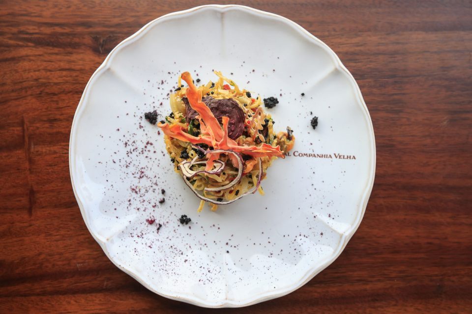 São os olhos os primeiros a devorar a entrada colorida que o chef Julien Montbabut trouxe de Paris para a mesa do Le Monument. A apresentação elegante e criativa que, de resto, caracteriza todos os seus pratos, chega com a sapateira sob a forma de uma paleta de cores. O crustáceo é servido desfiado e emparelhado com uma leve mousse de yuzu, sobre uma base de guacamole, curd de limão e mostarda. Guarnições em tons de verde e amarelo que também pontuam todo o prato. Chegando à mesa, a composição é desmantelada e misturam-se todos os ingredientes, numa alegre surpresa para o palato. É um prato delicado, cremoso e memorável. AC