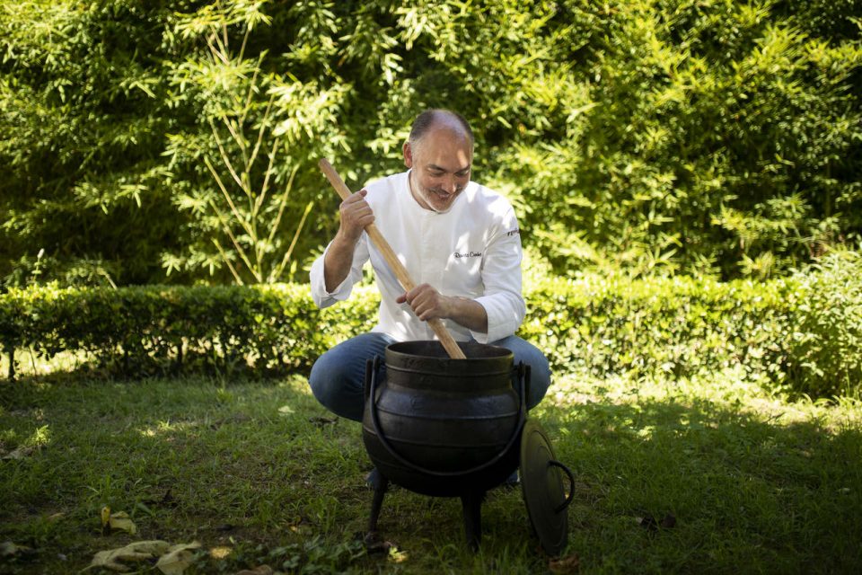 Trata-se de uma “cozinha de memórias”, diz Renato Cunha, fã destes potes de ferro fundido antigos e recuperados, cujo formato esférico não deixa a comida pegar-se ao fundo. Além disso, a cozedura é uniforme em todas as partes do pote. E, para cozinhar em lume máximo ou mínimo, basta arrastá-lo mais ou menos para o centro da fogueira, num trabalho braçal que também tem o seu encanto, observa, sorridente.