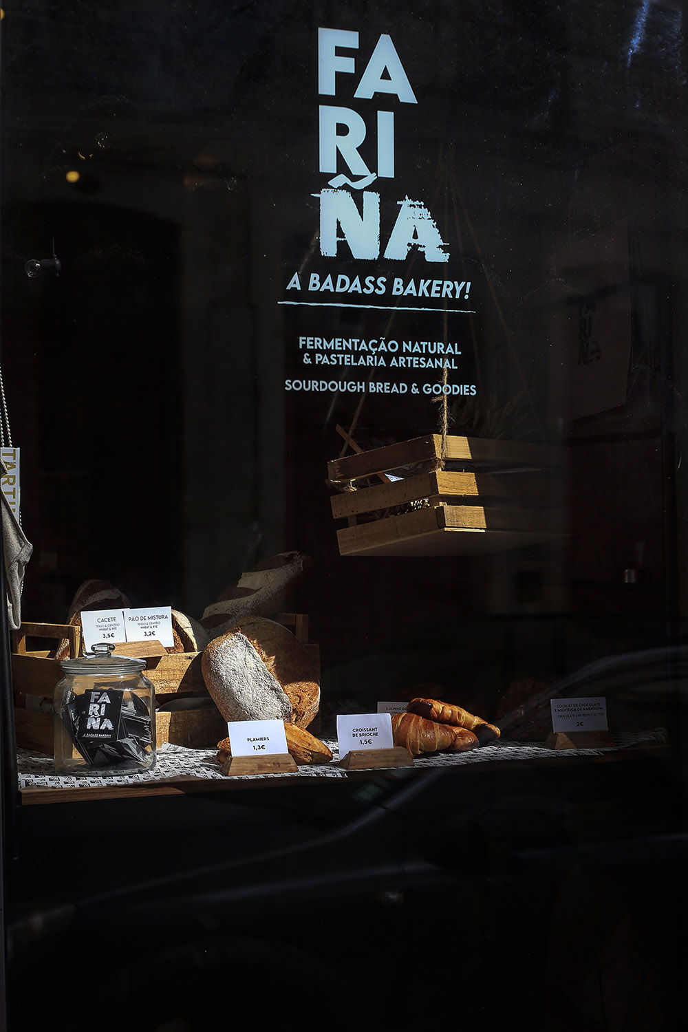 O primeiro ano de vida foi feito com entregas ao domicílio e presença assídua no Mercado da Alegria, que acontece ao domingo no Jardim do Passeio Alegre. Foi no evento que a marca se deu a conhecer e que começou a fidelizar clientes, pelo que é um lugar especial para casal, que tenta sempre apresentar algo novo. “A nossa ideia sempre foi variar muito a oferta. Procuramos ter sempre coisas novas”, explica. É esta inquietação, associada a combinações improváveis de sabores e ao aspeto tosco – aqui valoriza-se o sabor e não o aspeto -, que levou o casal a publicitar a Fariña como uma “badass bakery” (em português, “padaria rebelde”). Na base, tanto dos produtos de padaria como de pastelaria, está sempre a paciência que a fermentação natural requer, farinhas nacionais moídas em mó de pedra na Paulino Horta, sal e água.
