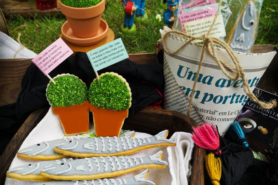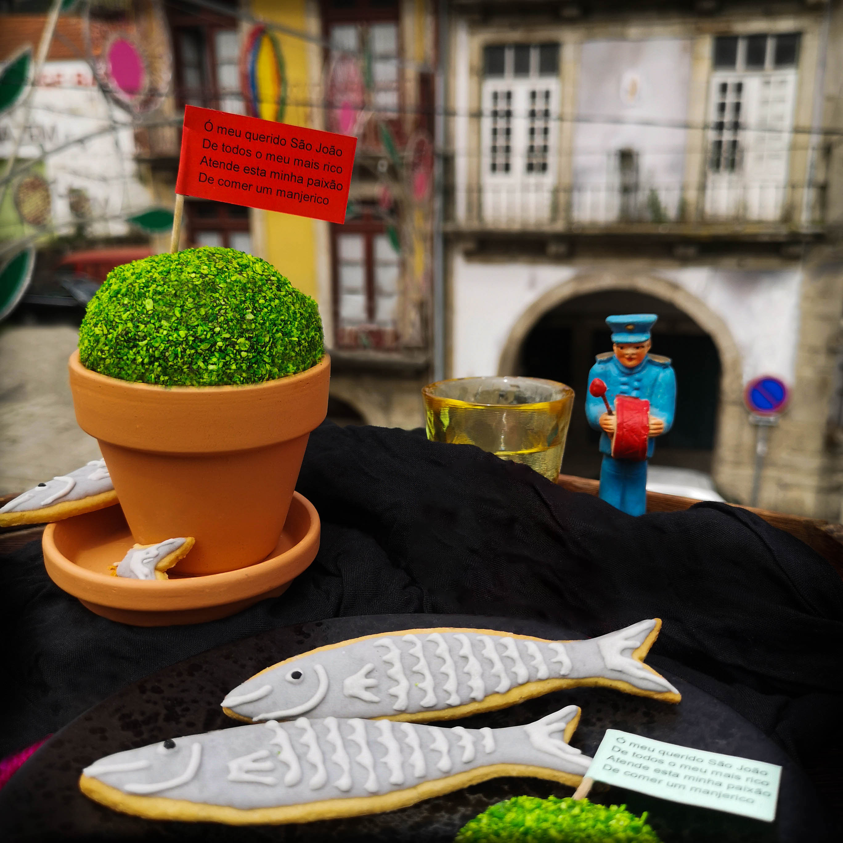 Ao queque-manjerico de chocolate, que já estava na ementa, acrescentam-se as bolachas de São João, receita de manteiga, com formatos alusivos à época. Bolachas que são sardinhas decoradas com glacê, bolachas que são manjericos que levam bocadinhos de coco. Com quadras a preceito, obviamente. Com pronúncia do Norte, naturalmente. Com a assinatura da Azeitonita.