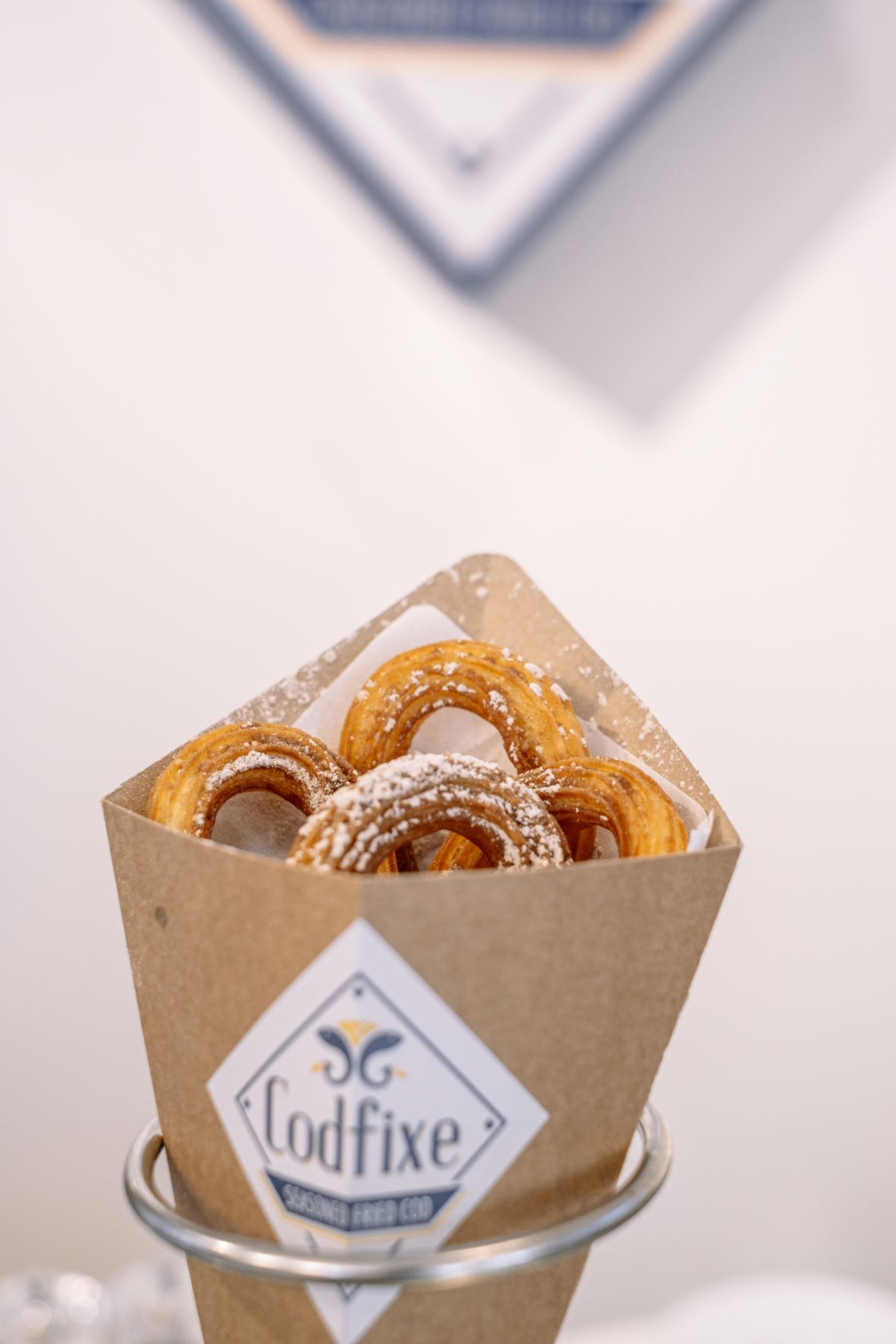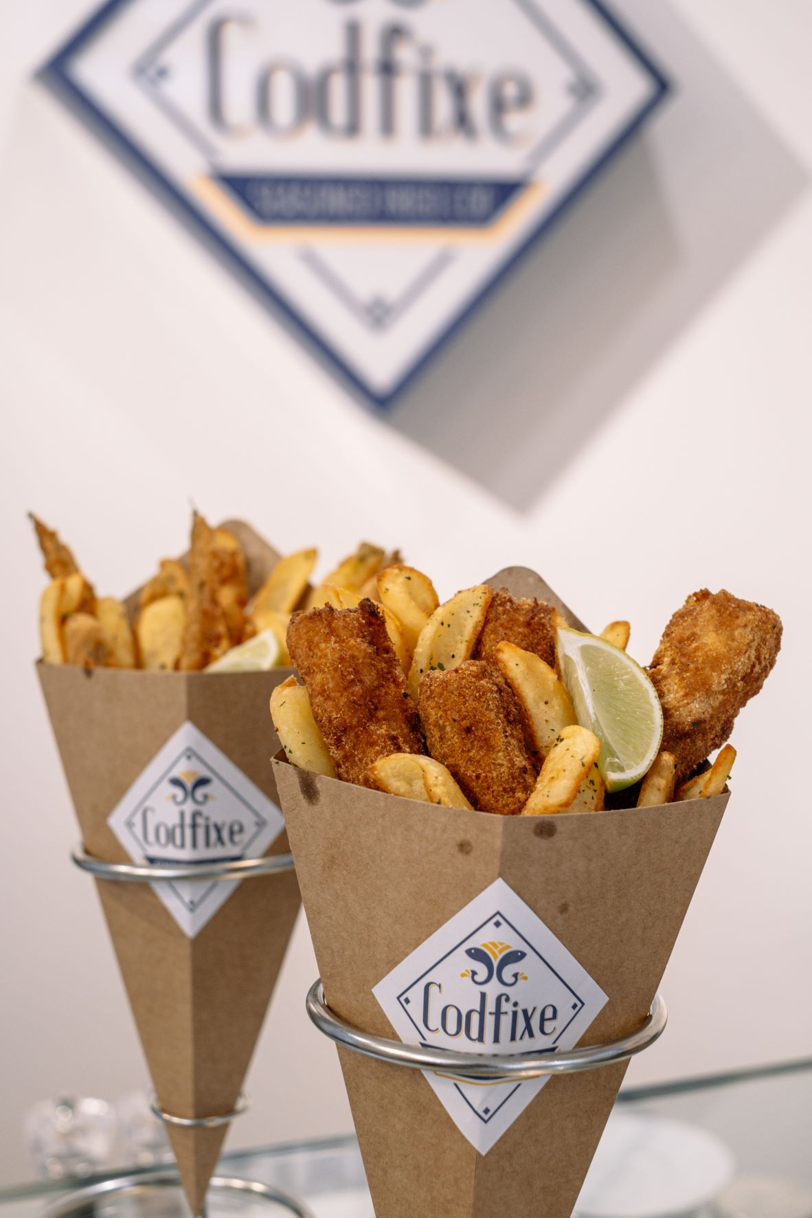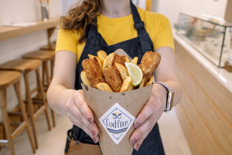 Inspirados no prato britânico “fish & chips”, que junta, num cone, peixe panado e batatas fritas, os amigos Frances Monteiro e Valter Amaral criaram o Codfixe, um restaurante de fast-food, que pretende agradar a portugueses e estrangeiros, que não querem perder muito tempo a comer. Neste espaço na Rua de Cedofeita, onde se fomenta o conceito de “pegar e levar”, o serviço é expedito a preparar os cones de cartão, que podem ser pedidos nos ecrãs táteis à entrada, recheados com um apaladado e crocante bacalhau fresco panado, e batatas cortada em forma de canoa, ideias para mergulhar nos molhos.