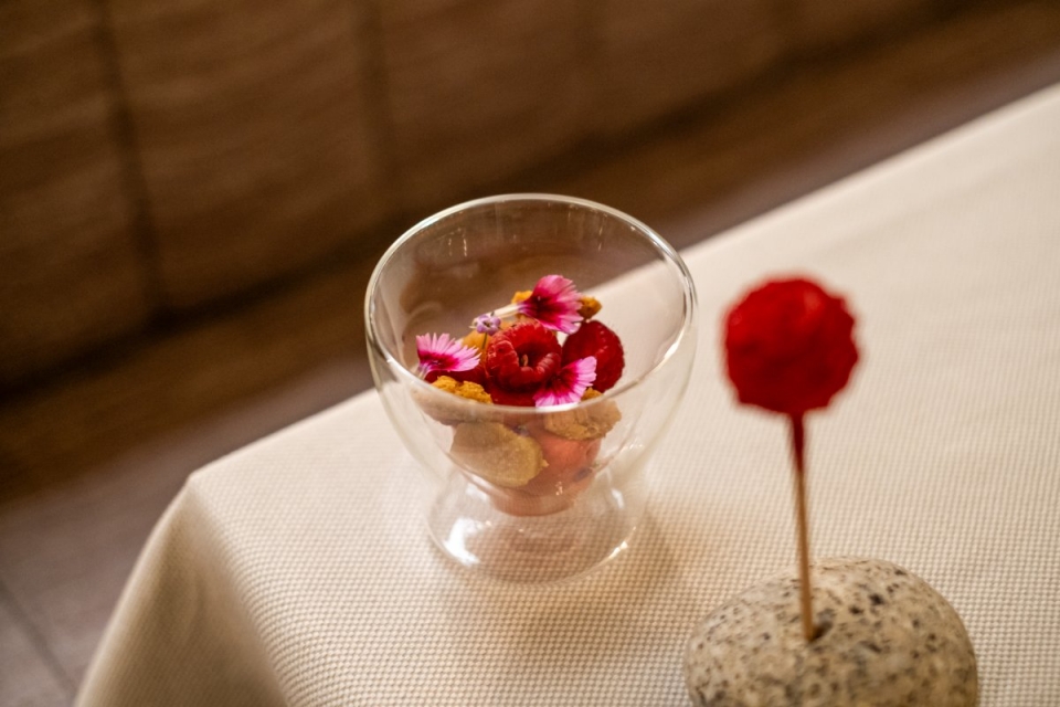 No centro da flor há polpa de framboesa pura, que é congelada e mergulhada em chocolate branco a saber a framboesa também. A seguir, leva uma ganache montée, com uns toques de funcho, aplicada com um saco de pasteleiro, criando pétala a pétala. A acompanhar vai um copo com sorvete de framboesa e ruibarbo, biscoito crocante, framboesas, ruibarbo em calda e flores. Para apreciar esta sobremesa, mantida enquanto houver ruibarbo, basta pedir um dos dois menus de degustação, com dez ou 14 momentos, que nos levam de viagem por Portugal.