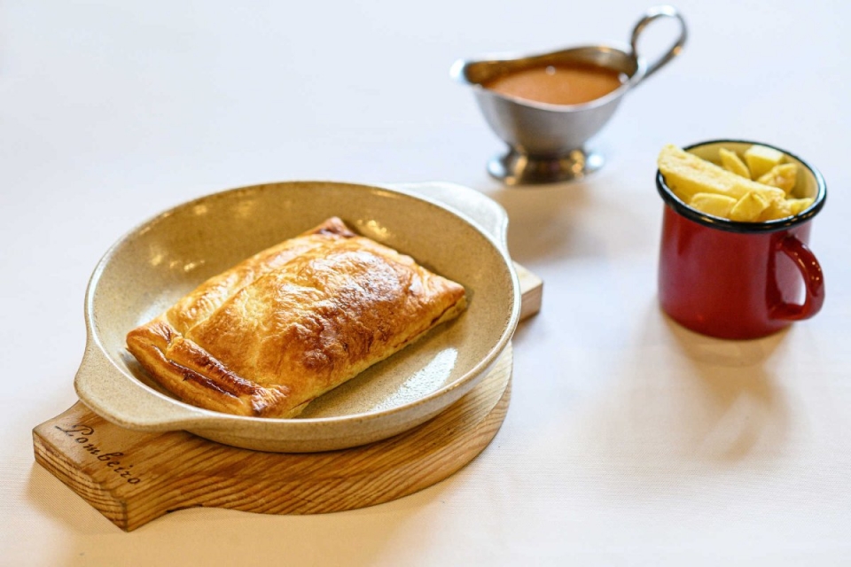 Manuel Pinto, à frente do restaurante Pombeiro desde 1996, teve a “honra e o gosto” de conviver com Daniel David Silva, que criou a francesinha na Regaleira nos idos anos 1950. Quando decidiu acrescentar o prato ao cardápio do seu restaurante, não quis copiar o que já estava criado e recriado. E como a cozinha do Pombeiro já trabalha muito a massa folhada, o chef e proprietário desenvolveu uma ideia nova, já lá vão 14 anos.