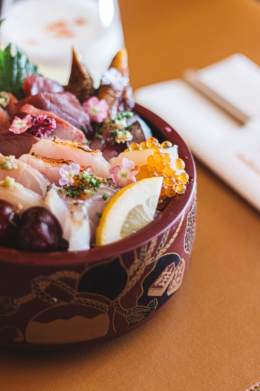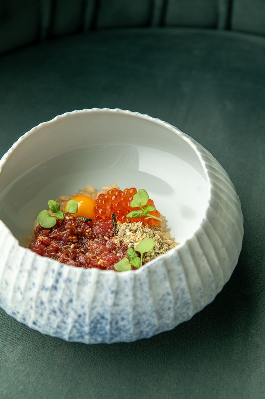 Nas entradas, destaca-se o shiso crispy, uma folha de erva aromática da família da hortelã em tempura, com tártaro de salmão. A enguia grelhada marinada com molho à base de soja brilha nos nigiri, enquanto o choux à la crème com paçoca e gelado de matcha encerra de forma doce.