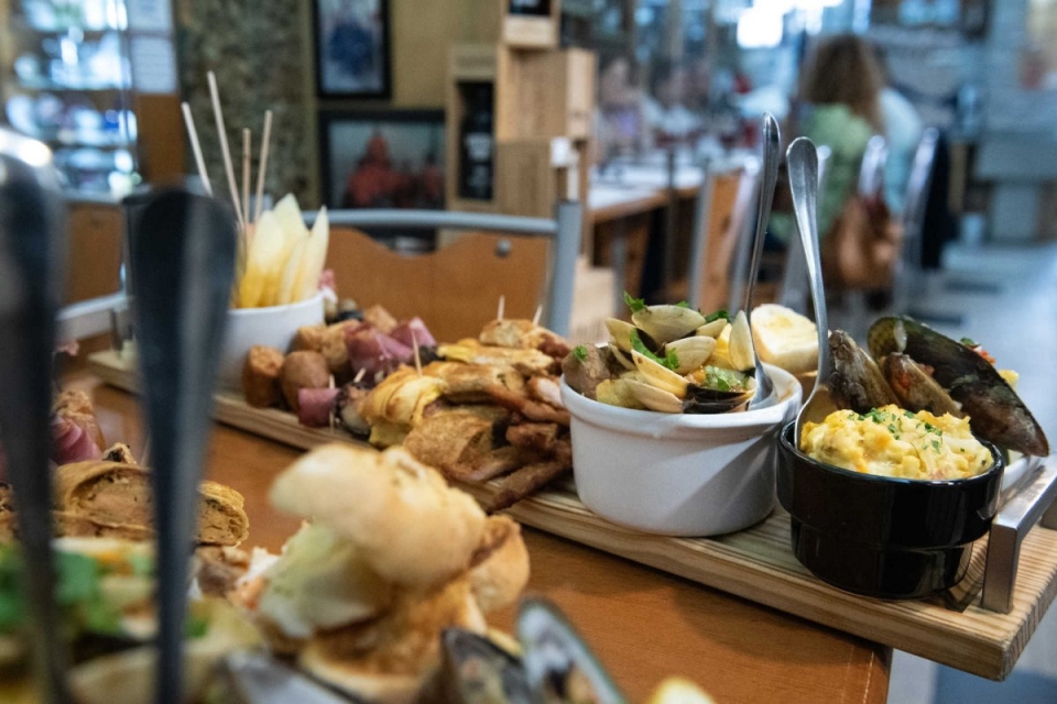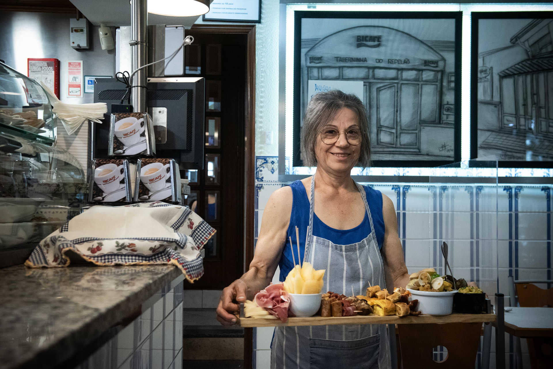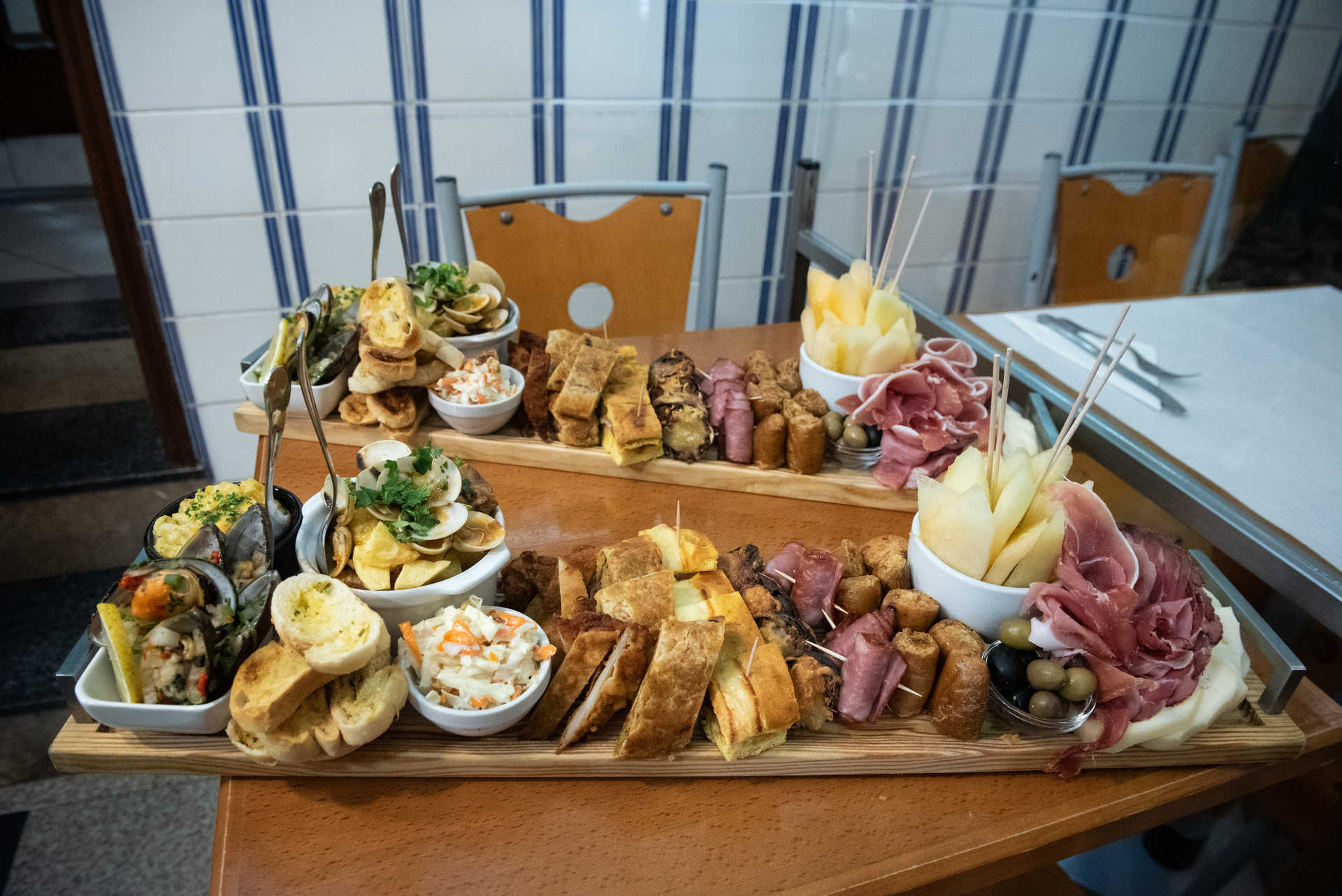 A aposta inicial recaiu sobre o prego em pão. Até que se resolveu “pôr um bocadinho de cada coisa em cima da tábua”, salgados e outras propostas, recorda Manuel. Assim ficou. O tamanho varia consoante o número de pessoas. Há tábuas para uma, duas, três e por aí em diante. Tudo se vai adaptando, mesmo o conteúdo. Estão garantidos melão, presunto, queijo, alheira, bôla de carne. Sexta e sábado são dias de camarão salteado, mexilhão e polvo. Na tábua também se dá a provar comida de tacho, que muda todos os dias – pode ser feijoada, tiborna de alheira, bacalhau à Brás… Há, portanto, uma certa dose de surpresa.
