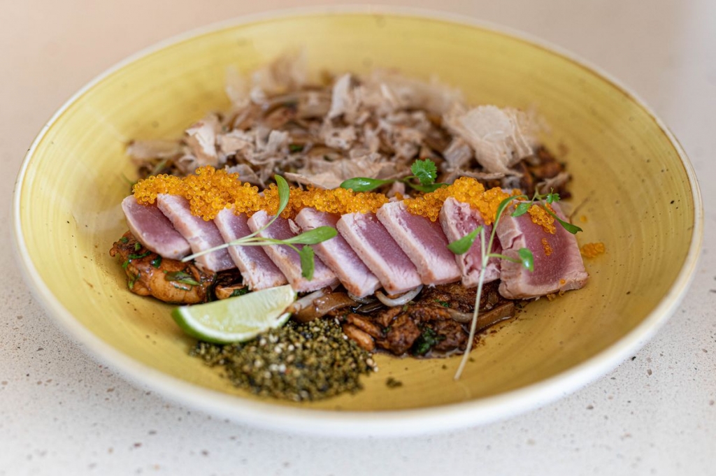 Carpaccio de novilho com ovo de codorniz; taco de salmão com ovo de codorniz; poke de lombo de atum e kimchi; poke de vazia de kobe e foie gras; pad thai de tataki de atum e katsuobushi; e nasi goreng com tonkatsu de porco preto ibérico são as novidades que se podem provar no restaurante. Para sobremesa, há um novo mil folhas de chocolate branco e maracujá com gelado de fava tonka.