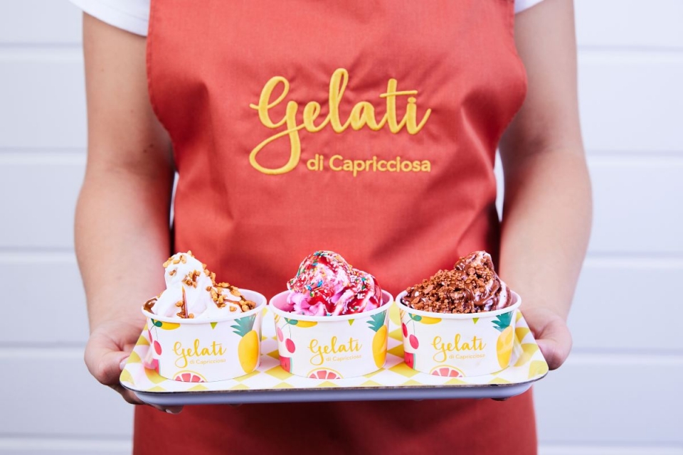 Com valores entre os 3,40 e os 6,10 euros, consoante o tamanho, os copos e cones de gelado podem ser finalizados com coberturas coloridas, como petazetas, sprinkles, marshmallows, banana ou caramelo salgado, entre outros. Outra das hipóteses é optar pelo Capriccioso, uma receita já criada com três variações à escolha do cliente.